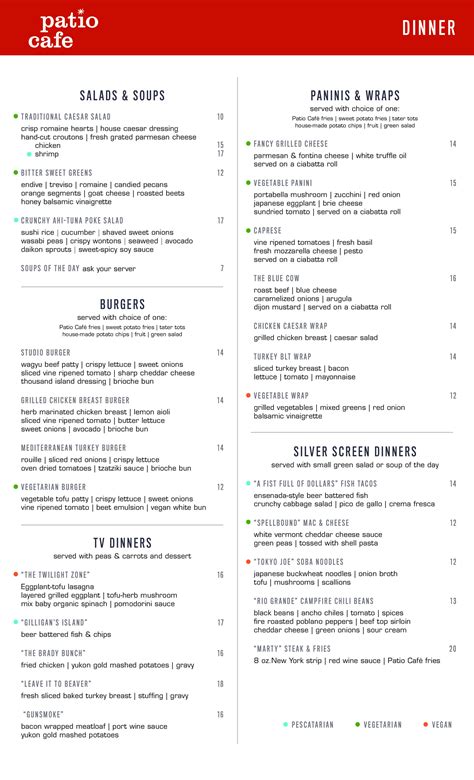 The patio restaurant menu is a carefully crafted selection of dishes that are designed to provide a unique and satisfying dining experience. Our menu offers a wide variety of options to satisfy any craving, all while enjoying the fresh air and beautiful scenery of our outdoor seating area.